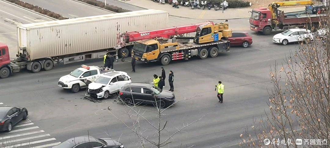 1月26日,情报员“在线翻译”向齐鲁晚报官方客户端齐鲁壹点情报站报料称,26日午后1点左右,在济南市飞跃大道与新村中路交叉口,一辆白色SUV和一辆黑色SUV相撞,白色SUV车头受损比较重,车辆零部件散落一地,交警已经抵达现场处理。
