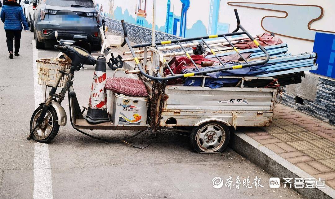 1月26日,情报员“C12359”向齐鲁晚报官方客户端齐鲁壹点情报站发来一则情报,在济南市历黄路与明湖东路丁字路口附近人行道上,有一辆“僵尸”三轮车,孤零零地停在那里,车身横在那里,足足占据了整个人行道,三个车胎扁瘪变形,车身锈迹斑斑,车上还装满杂物,阻碍了通行。